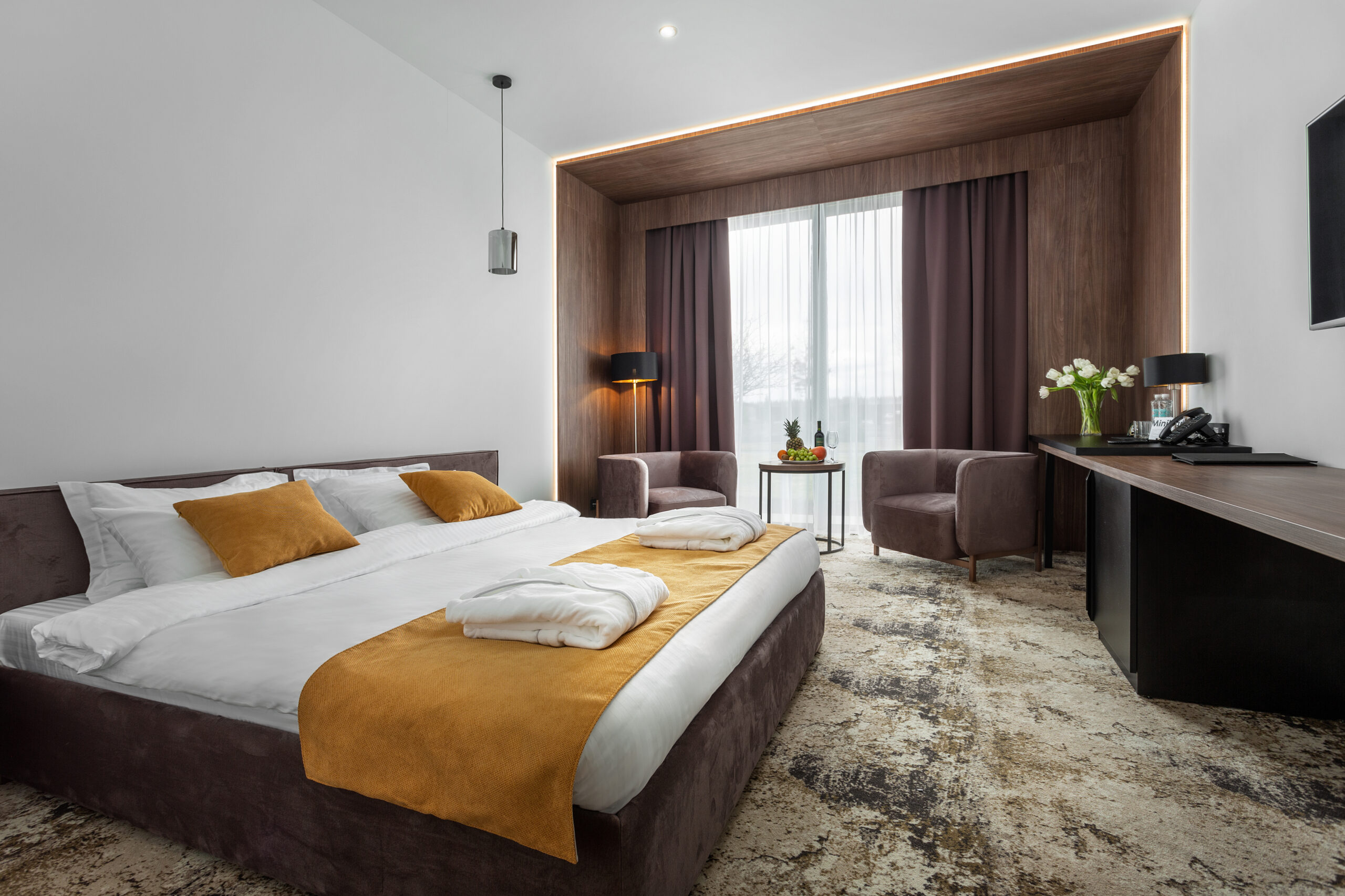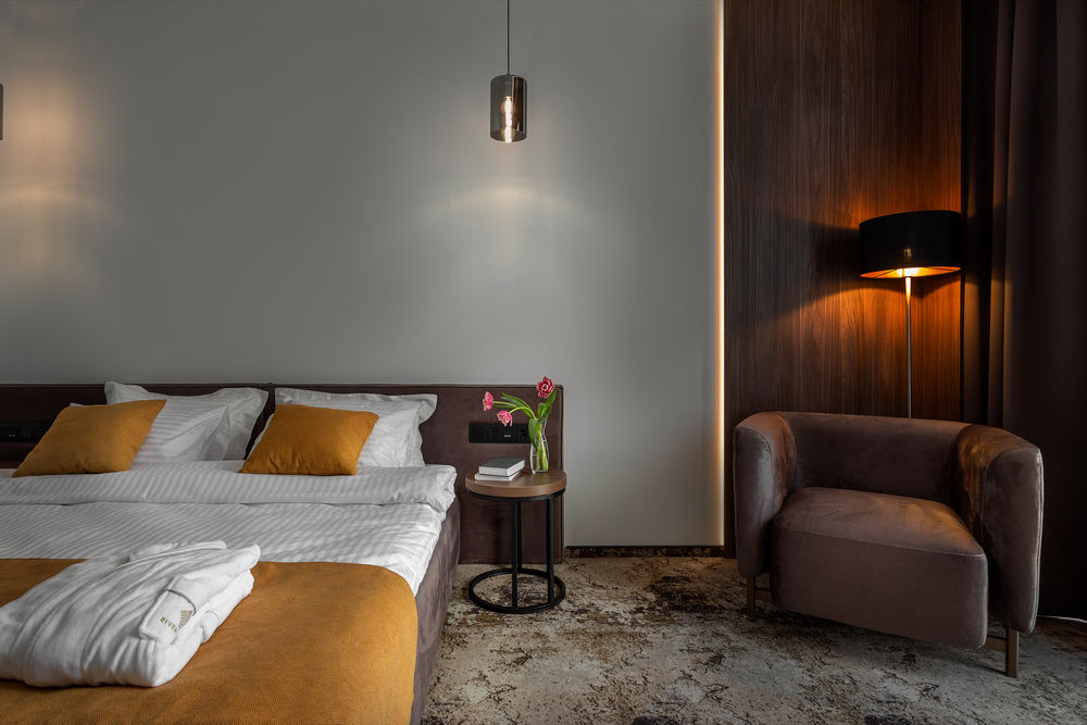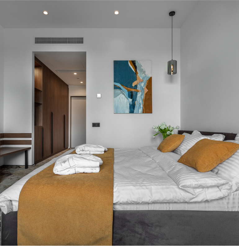 Просторий однокімнатний номер категорії Стандарт з великим двоспальним ліжком. Крізь панорамні вікна відкривається чудовий вигляд на озеро, ландшафтний парк та мост – арт обʼєкт.